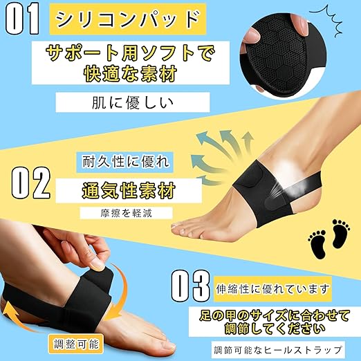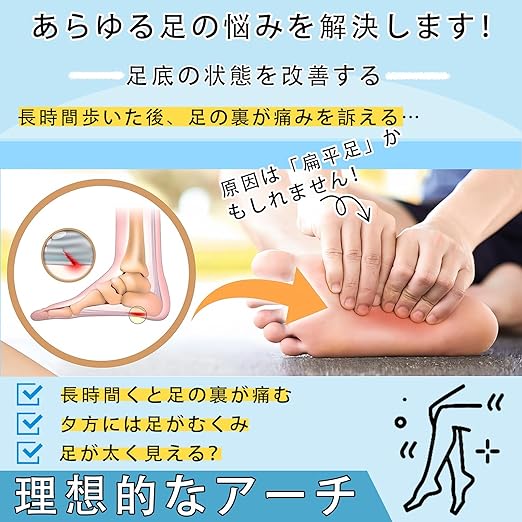 【様々な用途に適用】:靴の中に入れるインソールと違い、足に直接装着するため、その日の靴によって履き替える必要がありません。スリッパを履くときや室内で裸足になるときにも使用できる。アーチサポートが足裏を補い、歩行を楽にします。ウォーキング、通勤・通学、立ち仕事、掃除、料理などの家事、ヨガ、ランニング、エクササイズ、ハイキングなど、どんなシーンでも安心してお使いいただけます。