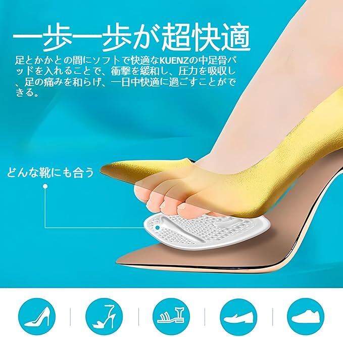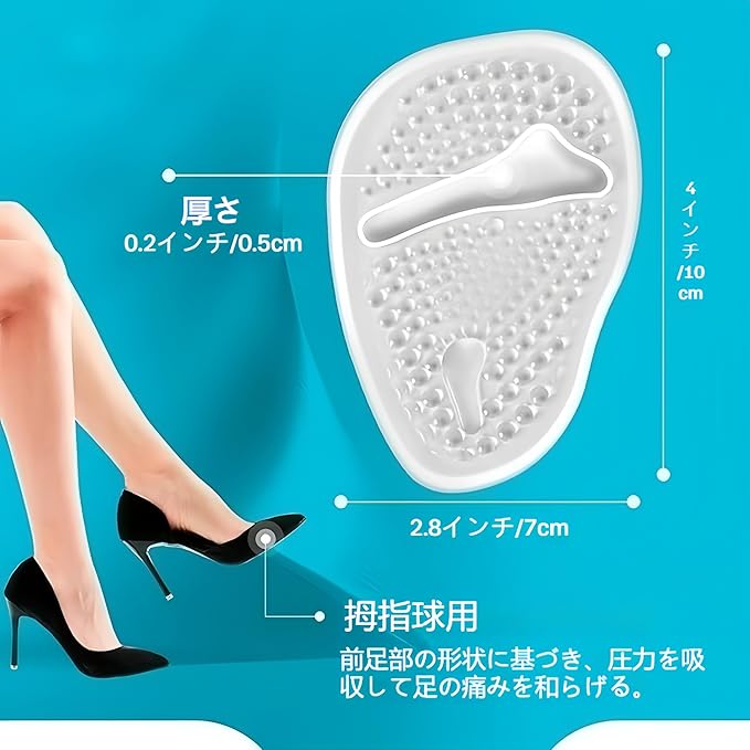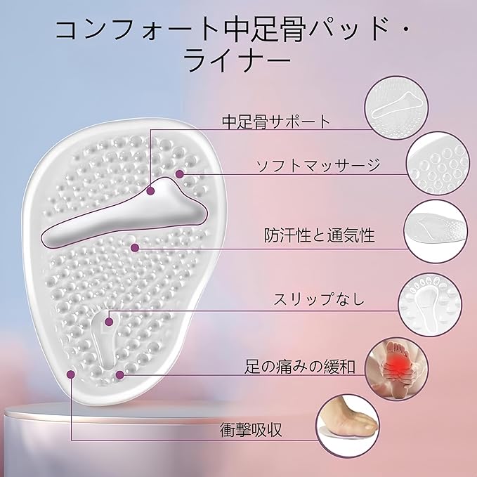 【快適なサポート】:中足骨パッドは高品質のソフトゲルで作られています。 ハイヒールを履いての仕事、ダンス、ショッピングなど、この中足骨パッドは優れたクッション性と衝撃吸収性を提供し、足の痛みを和らげます。