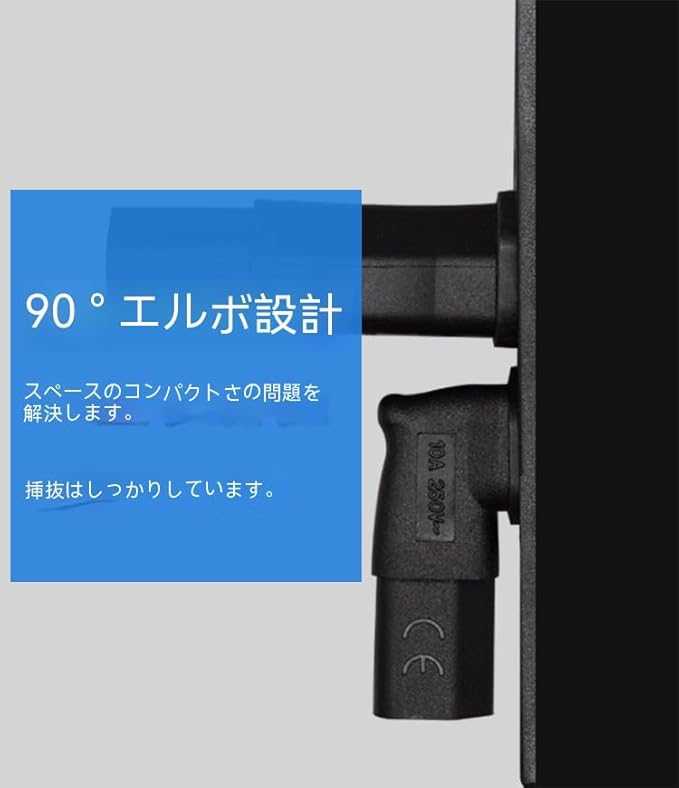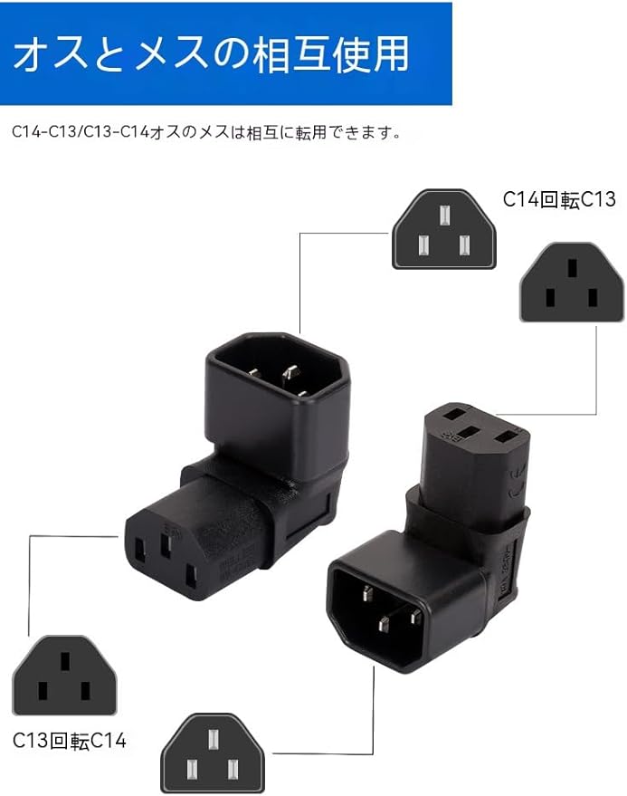 3ピン変換コネクタ L型上向き【電源ケーブルの取り回し、配線スペースの確保に! (定格:10A/250V) 3ピンメス(IEC 60320 C13)から3ピンオス(IEC 60320 C14)に変換します