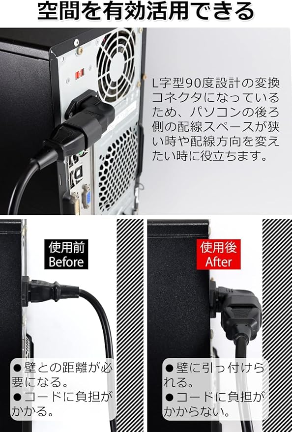- ✅ [製品用途]: コンピュータ、モニター、プリンター用のライトアングルコネクターは、狭いスペースで使用でき、電源コードの折り曲げによる損傷を防ぎます。 ライトアングルコネクターは、電源ポートの連続的な抜き差しを回避し、電源コードの寿命を延ばします。
