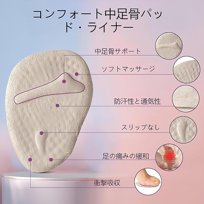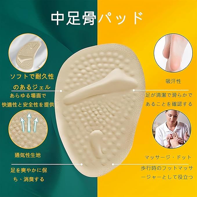 【快適なサポート】:中足骨パッドは高品質のソフトゲルで作られています。 ハイヒールを履いての仕事、ダンス、ショッピングなど、この中足骨パッドは優れたクッション性と衝撃吸収性を提供し、足の痛みを和らげます。