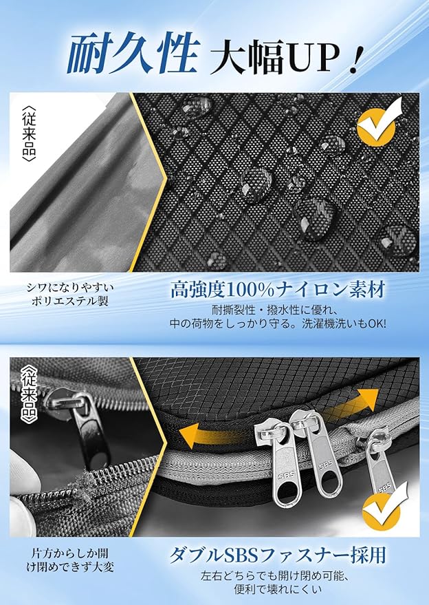 【高強度ナイロン生地&世界基準「SBS製ジッパー」で繰り返し使える】引き裂きに強い高密度ナイロンと、世界的なアウトドア限定商品でも多数採用される高品質「SBS製ジッパー」を採用。圧縮時の強い張力にも耐えるタフな仕様です。使い捨ての圧縮袋とは異なり、何度でも繰り返し使用できるため、経済的かつエコな選択です。★長持ちのコツ:パンパンに詰め込まず容量の7〜8割に抑え、上下の生地を寄せながら少しずつファスナーを閉めてください。