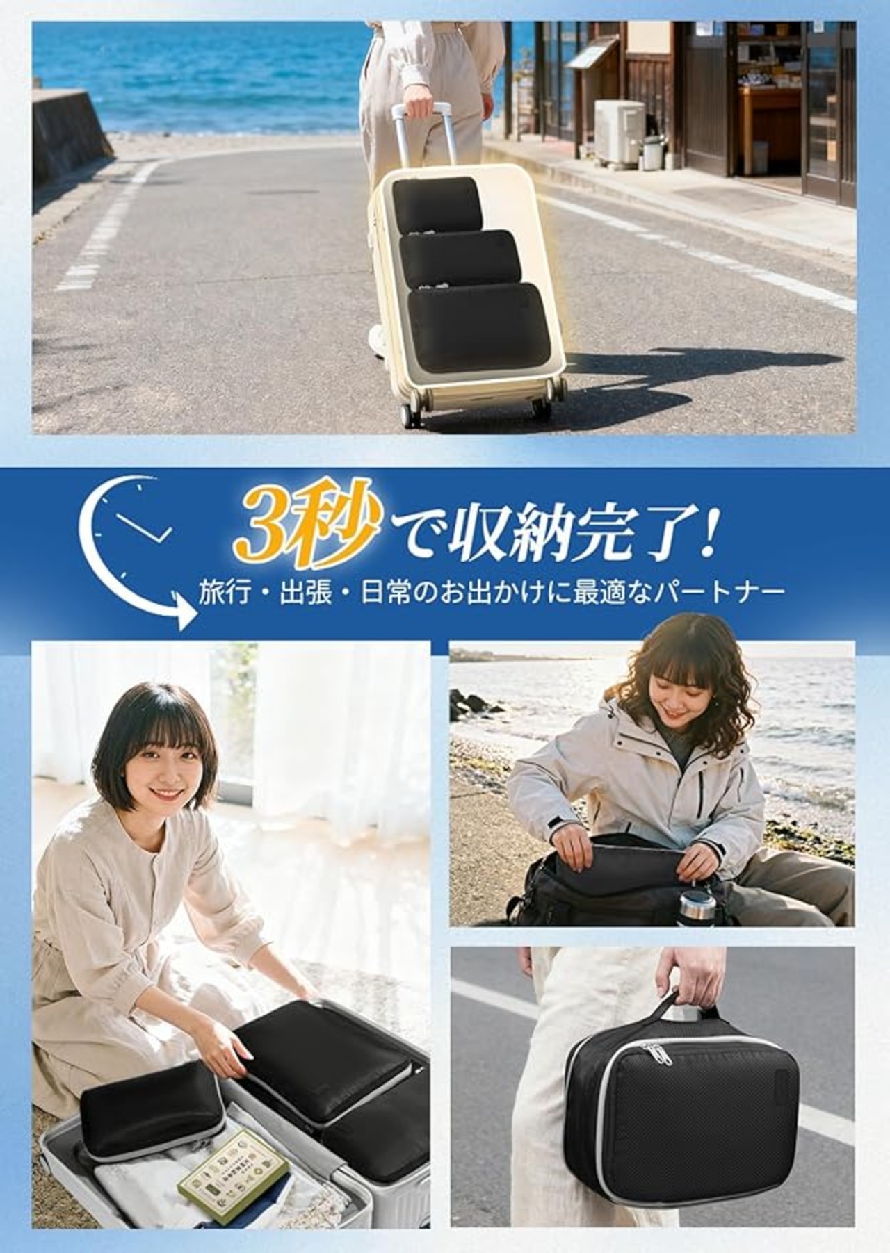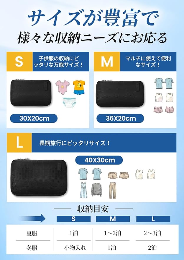 【宿泊数で選べる3サイズ・収納目安ガイド】用途や宿泊数に合わせて最適なサイズをお選びいただけます。■Sサイズ(30 20 3cm):日帰り〜1泊(下着、靴下、子供服、おむつ等)■Mサイズ(36 20 3cm):1〜2泊(春秋物トップス・ボトムス、日常整理)■Lサイズ(40 30 3cm):2〜3泊以上(厚手セーター、大容量スーツケース整理)※衣類の厚みにより実際の収納量は異なります。
