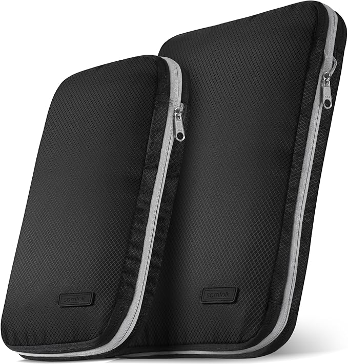 Samfolk トラベルポーチ 旅行用圧縮袋 【ファスナーで簡単圧縮・約40%スペース節約】 旅行ポーチ 圧縮バッグ パッキングポーチ 衣類仕分け 両面収納 撥水 旅行 出張 おむつポーチ 便利グッズ(ブラック,M+L)