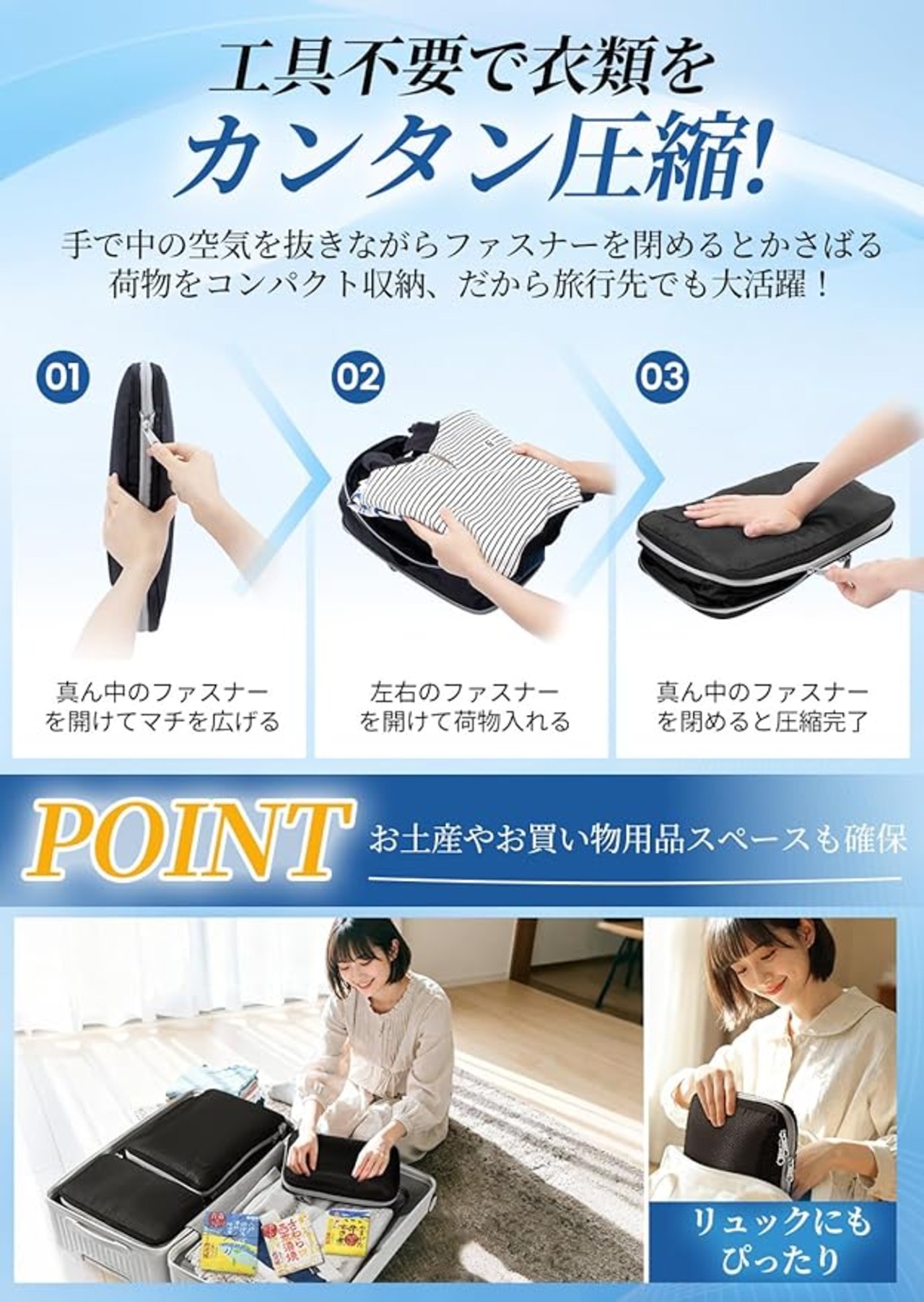 【ファスナーを閉めるだけ!最大約40%省スペース】衣類を入れて外側のファスナーを閉めるだけで、かさばる衣類のボリュームを抑え、最大約40%のスペースを節約します(※素材や量により異なります)。★上手に収めるコツ:衣類を筒状に丸めて隙間なく詰めると綺麗にまとまります。(※真空圧縮袋ではありません。適度なボリューム軽減と整理目的でご使用ください。)