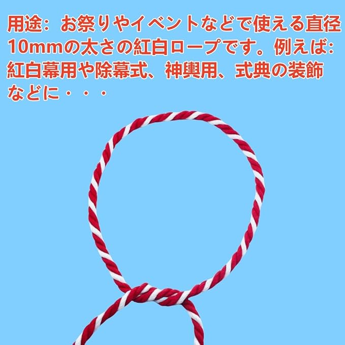 用途:お祭りやイベントなどで使える直径10mmの太さの紅白ロープです。例えば:紅白幕用や除幕式、神輿用、式典の装飾などに・・・