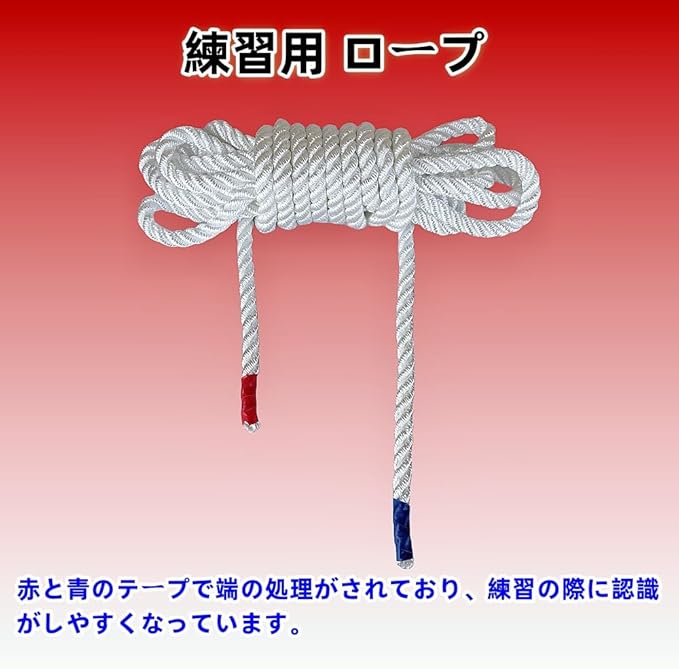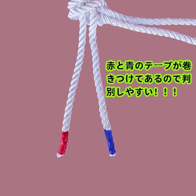 材質:ポリエステル、重量:約200g、ロープの両端:赤と青のテープが巻きつけてあるので判別しやすい。