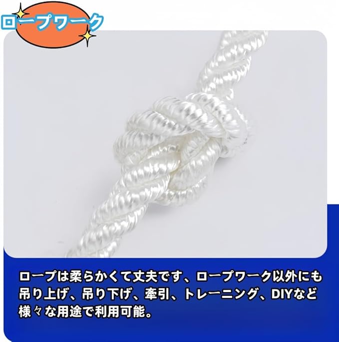 ロープは柔らかくて丈夫です、ロープワーク以外にも吊り上げ、吊り下げ、牽引、トレーニング、DIYなど様々な用途で利用可能。