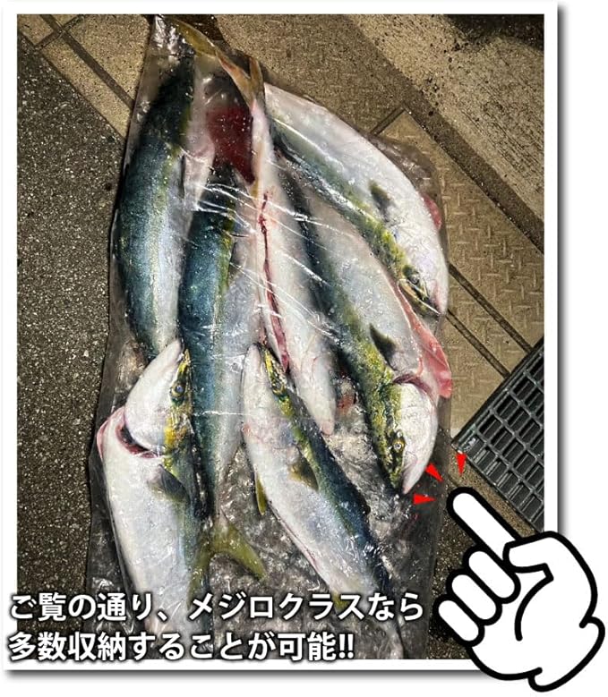 釣り上げたブリやヒラマサなどの大型魚や、たくさんの魚を保管するのに便利なビッグサイズ(長さ1300mm・幅600mm)の魚収納袋。