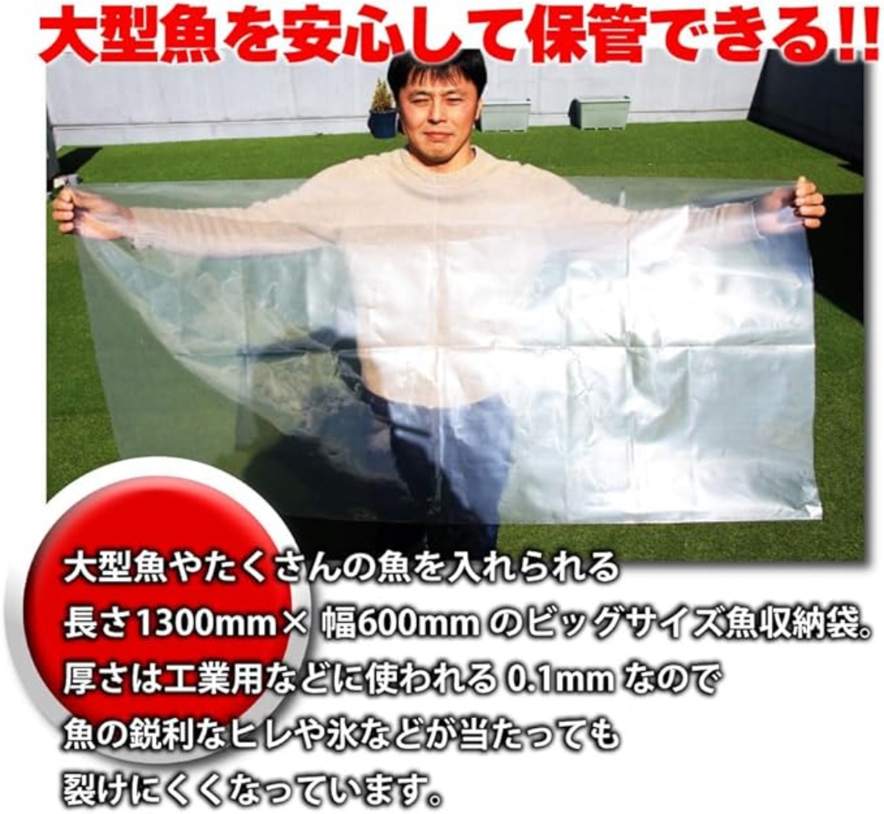釣り上げたブリやヒラマサなどの大型魚や、たくさんの魚を保管するのに便利なビッグサイズ(長さ1300mm・幅600mm)の魚収納袋