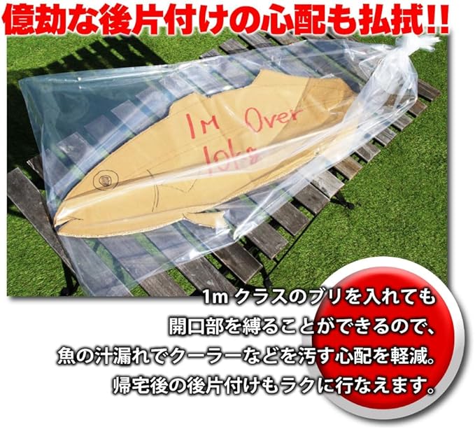 1mクラスのブリを入れても開口部を縛ることができるので、魚の汁漏れでクーラーなどを汚す心配を軽減。帰宅後の後片付けもラクに行なえます