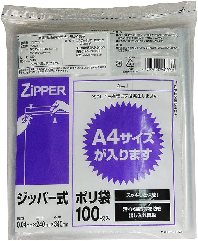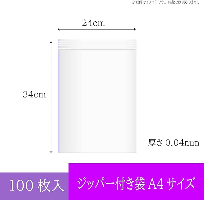 ジッパー式ポリ袋 透明 100枚入 A4サイズ 4-J