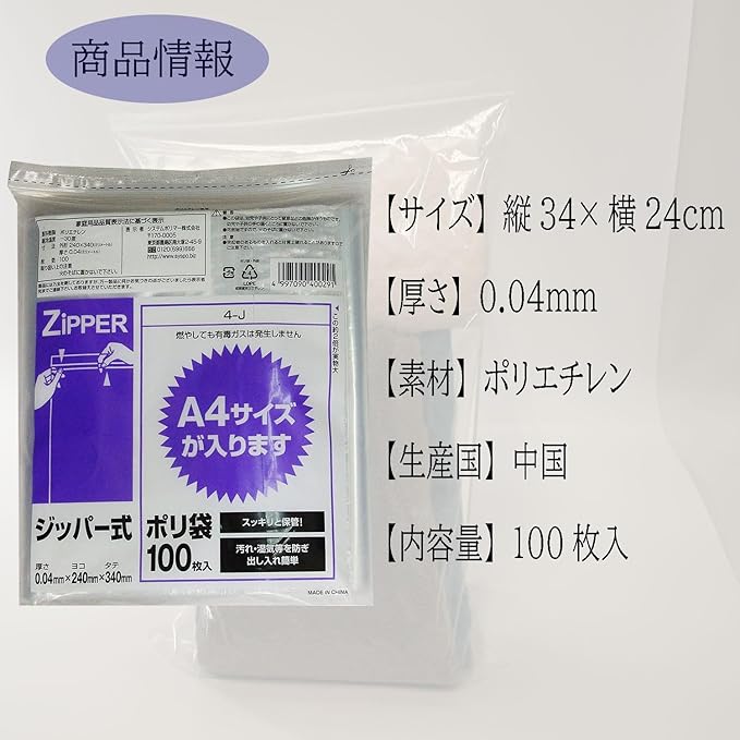 商品紹介 ●ジッパー式ポリ袋100枚入りA4サイズが入ります。●スッキリと保管、汚れ・湿気等を防ぎ、出し入れ簡単。●本品は燃やしても有毒ガスは発生しません。警告●この袋は、幼児や子供にとって窒息などの危険が伴うものです。幼児や子供の手の届くところに置かないで下さい。●可燃物ですので、火のそばに置かないで下さい。注意●突起物のあるものを入れると材質上破れることがありますのでご注意下さい。 Amazonより ●燃やしても有毒ガスは発生しない! ●スッキリと保管! ●汚れ・湿度等を防ぎ、出し入れ簡単!