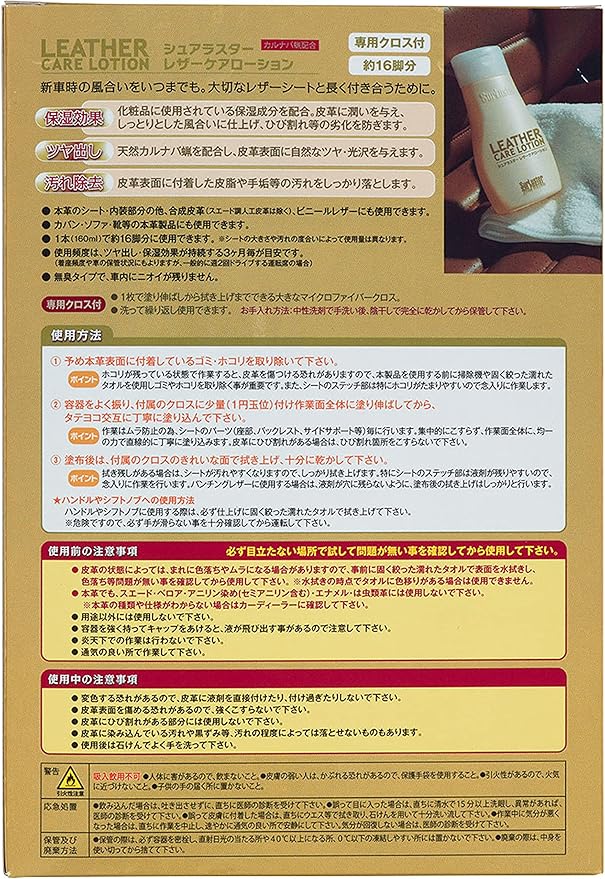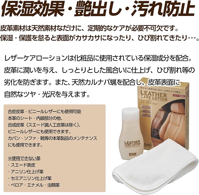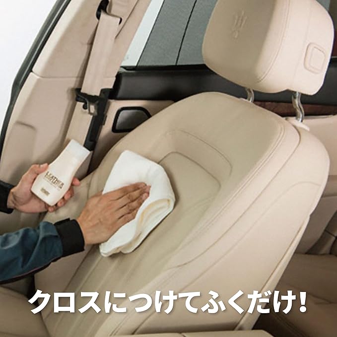 新車時の風合いをいつまでも。大切なレザーシートと長く付き合うために。 保湿効果 化粧品に使用されている保湿成分を配合。皮革に潤いを与え、しっとりとした風合いに仕上げ、ひび割れ等の劣化を防ぎます。 ツヤ出し 天然カルナバ蝋を配合し、皮革表面に自然なツヤ・光沢を与えます。 汚れ除去 皮革表面に付着した皮脂や手垢等の汚れをしっかり落とします。 ●本革のシート・内装部分の他、合成皮革(スエード調人工皮革は除く)、ビニールレザーにも使用できます。 ●カバン・ソファ・靴等の本革製品にも使用できます。 ●1本(160ml)で約16脚分に使用できます。 ※シートの大きさや汚れの度合いによって使用量は異なります。 ●使用頻度は、ツヤ出し・保湿効果が持続する3ヶ月毎が目安です。(着座頻度や車の保管状況にもよりますが、一般的に週2回ドライブする運転席の場合) ●無臭タイプで、車内にニオイが残りません。 専用クロス付 ●1枚で塗り伸ばしから拭き上げまでできる大きなマイクロファイバークロス。 ●洗って繰り返し使用できます。 お手入れ方法:中性洗剤で手洗い後、陰干しで完全に乾かしてから保管して下さい。