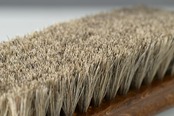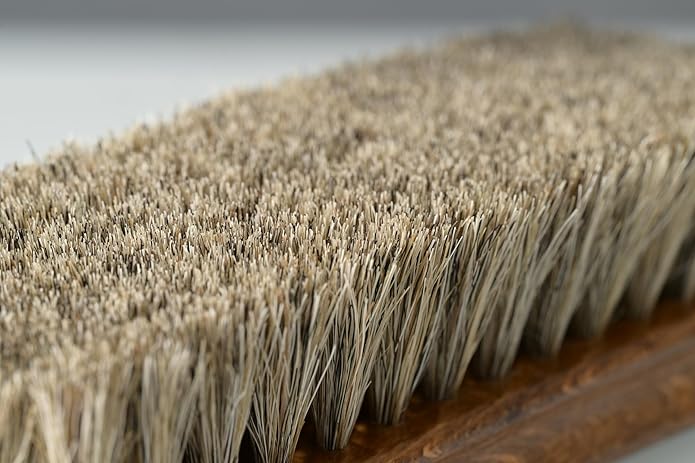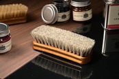 ホコリ落とし、仕上げ用の馬毛ブラシです。毛先がしなやかなため、皮革製品の表面やコバ周りのホコリ落とし、クリーム塗布後の仕上げのツヤ出しにおすすめです。レザージャケットやレザーバッグなど面積の大きい皮革製品に最適なサイズ感です。持ち手部分が反っており、加えて横に溝が彫ってあるため、持ちやすく、ブラッシングしやすい作りです。