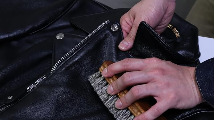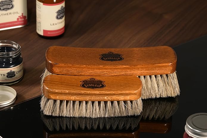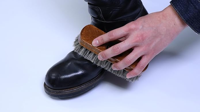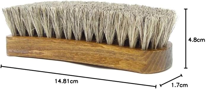 ホコリ落とし、仕上げ用の馬毛ブラシです。毛先がしなやかなため、皮革製品の表面やコバ周りのホコリ落とし、クリーム塗布後の仕上げのツヤ出しにおすすめです。短靴、ブーツ、財布、ベルトなどの皮革製品のお手入れに最適なサイズ感です。持ち手部分が反っており、加えて横に溝が彫ってあるため、持ちやすく、ブラッシングしやすい作りです。