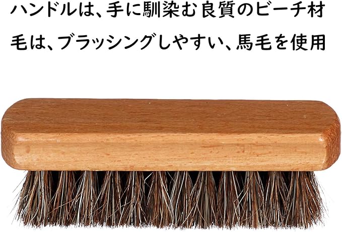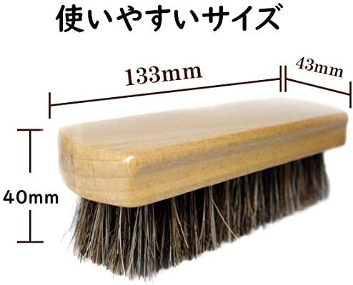サイズ:長さ133mm*幅43mm*厚さ:40mm(毛足長さ:約25mm)、 毛の種類:天然馬毛 100%、 用途:革製品のクリーム添付、ホコリ落としに。スムースレザー(一般的な表革)の靴、パンプス、ブーツ、