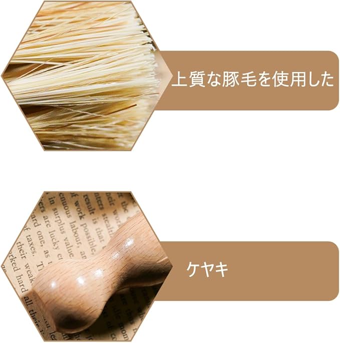【材質】上質な豚毛を使用した+ケヤキ、長持ちします、変形しにくく。