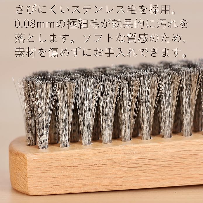 スエードやヌバック、ムートンなどの起毛革用お手入れブラシです。水に強く、サビにくいステンレス毛を採用。0.08mmの極細ステンレス毛で、デリケートな起毛革の毛足を傷めることなくブラッシング可能です。適度なコシを持たせているので、寝てしまった毛を起こす際にも活躍します。