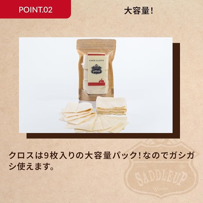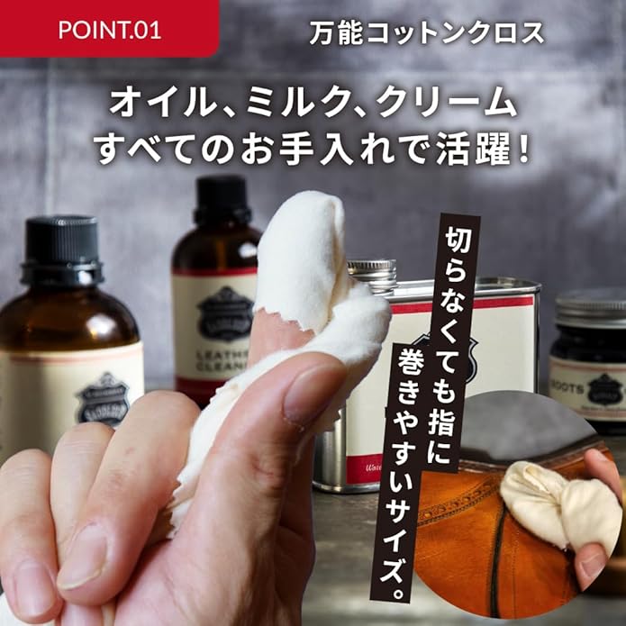 革靴、ブーツ、レザージャケット、グローブ、バッグ、財布などの革製品の汚れ落し、磨き上げ、ツヤだし、乾拭きなどオールマイティに使用できるクロスです。