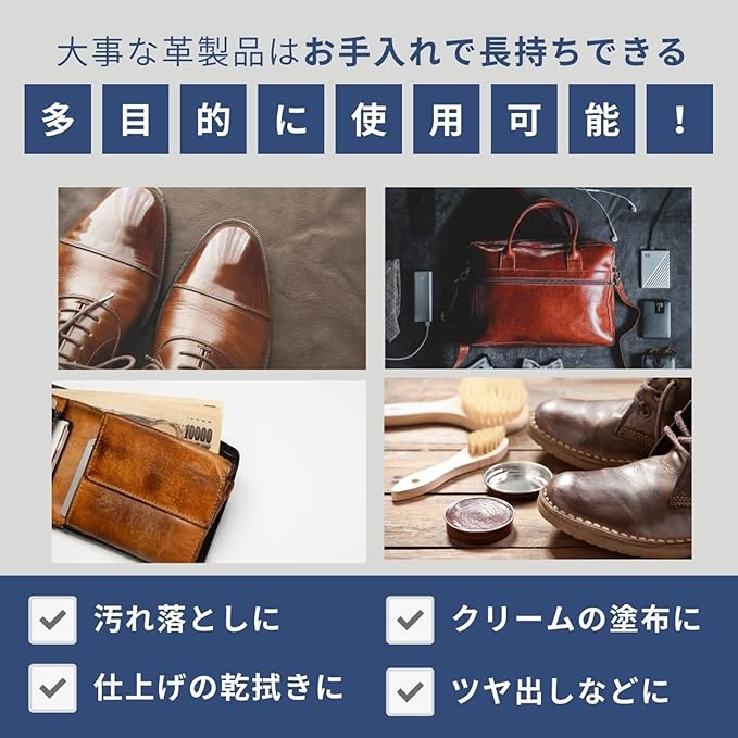 汚れ落としや、クリームの塗布、仕上げの乾拭き、ツヤ出しなど多目的にお使いいただけます。