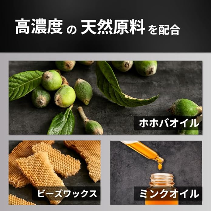 原材料:ビーズワックス(みつろう)、ホホバオイル、ミンクオイル