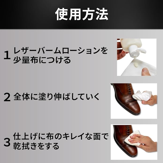 用途:スムースレザーの靴、バック、レザージャケット、レザーファニチャーなどの皮革製品のお手入れに。