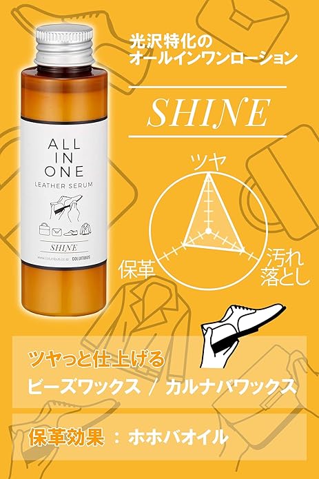 ツヤ出し、汚れ落とし、保革を1本で可能にするオールインワンローションです。