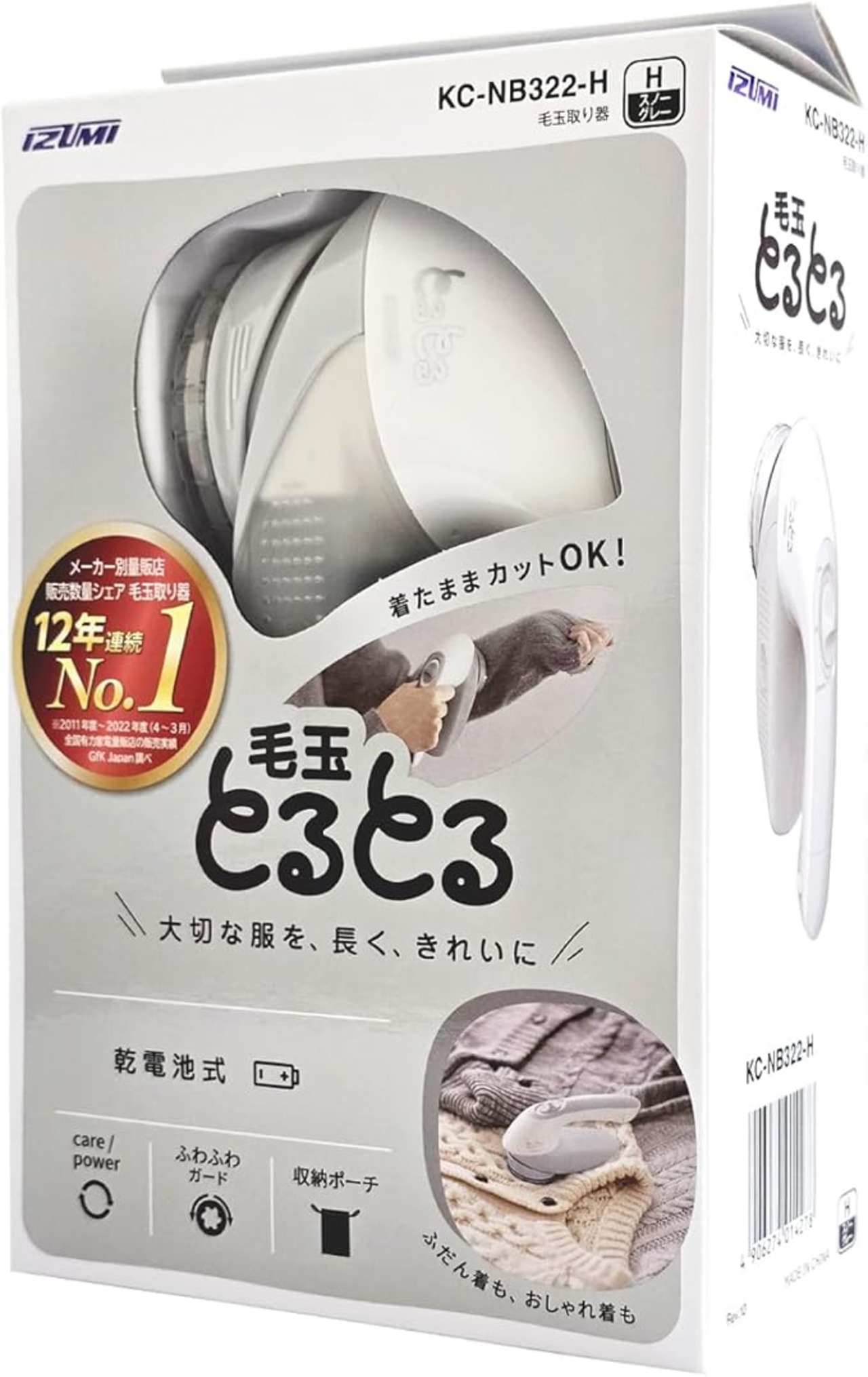 Izumi 電動毛玉クリーナー KC-NB322-H 毛玉取り器 毛玉とるとる 乾電池式 Careモード搭載 ポーチ付属 KC-NB322 (スノーグレー)