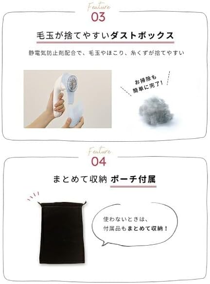 静電気防止剤配合で毛玉やほこり、糸くずが付きにくい。ダストボックスの取り外しが可能なので、たまった毛玉はワンステップで捨てられる。