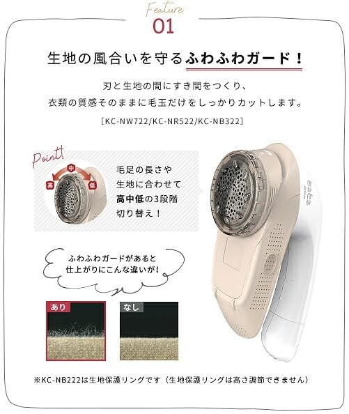 刃と生地の間にすき間をつくり、衣類の質感そのままに毛玉だけをしっかりカットします。毛足の長さに合わせて高・中・低の3段階切替。