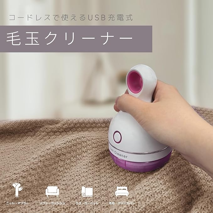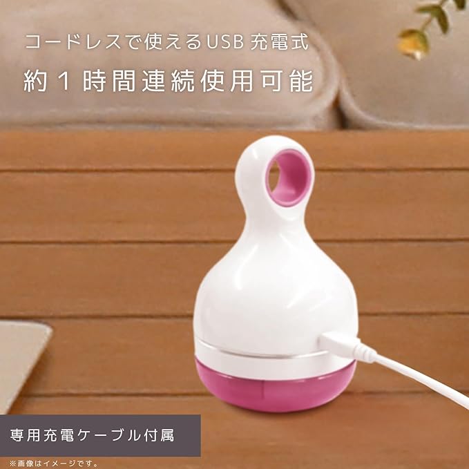 コードレスで使えるUSB充電式の毛玉取り器です。充電満タン時に連続で最大1時間使用できます。専用USB充電ケーブル(約1m)が付属。 ※充電器は付属していません