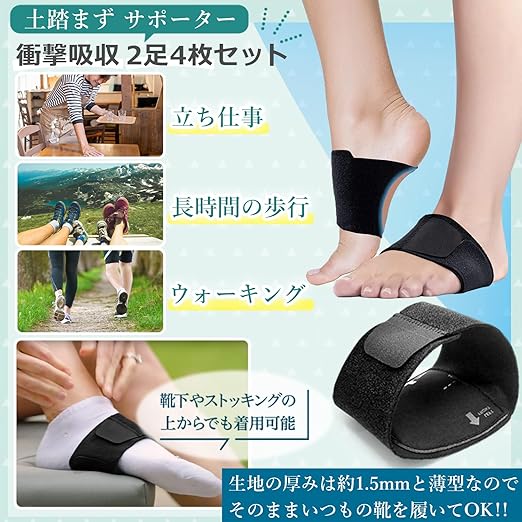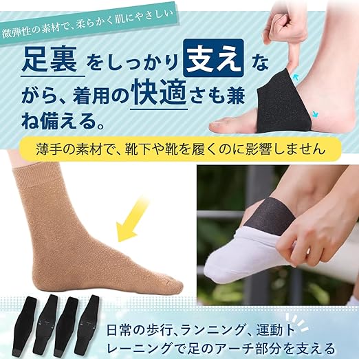 土踏まず サポーター 足裏サポーター 2足4枚セット あし 土踏まず インソール 衝撃吸収 負担 軽減 歩行 薄型設計 快適 伸縮性 仕事 買い物 スポーツ 抗菌 防臭