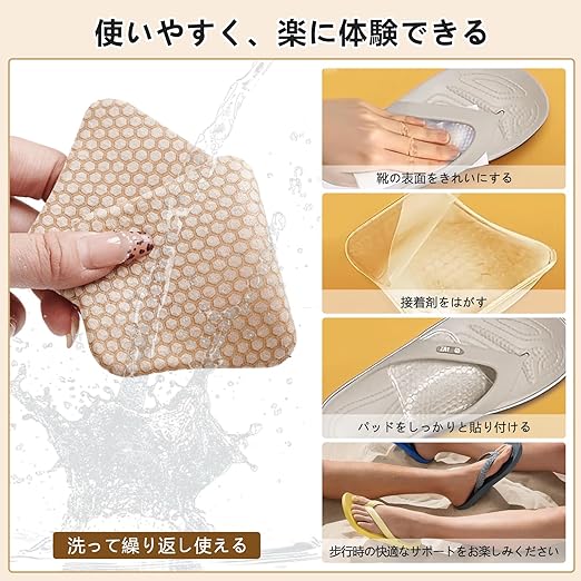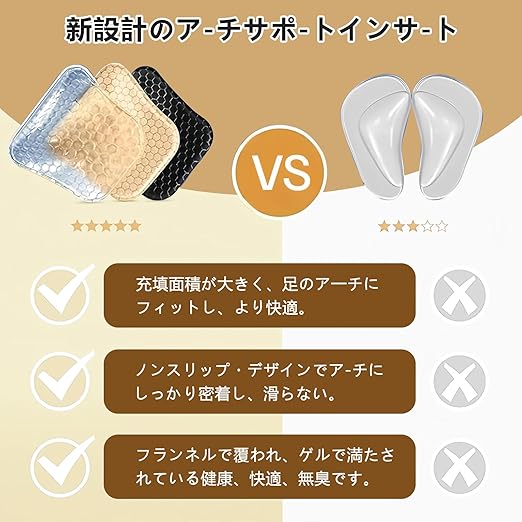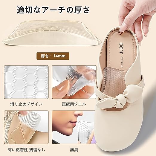 【長時間の歩行や立ち仕事を快適にサポート】足裏のアーチをしっかり支えるように設計された高品質クッション。柔らかく柔軟なシリコン素材が足の疲れや痛みを和らげ、歩行をサポートします。長時間の立ち仕事や運動が必要な方に特におすすめです。