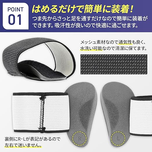 【様々な用途に適用】つま先から通す簡単着用です。スポーツ、立ち仕事、フィットネスなど様々な場面で活躍。丸洗い可能なため清潔に使用できます。