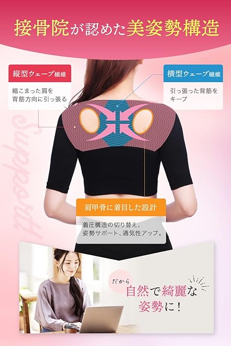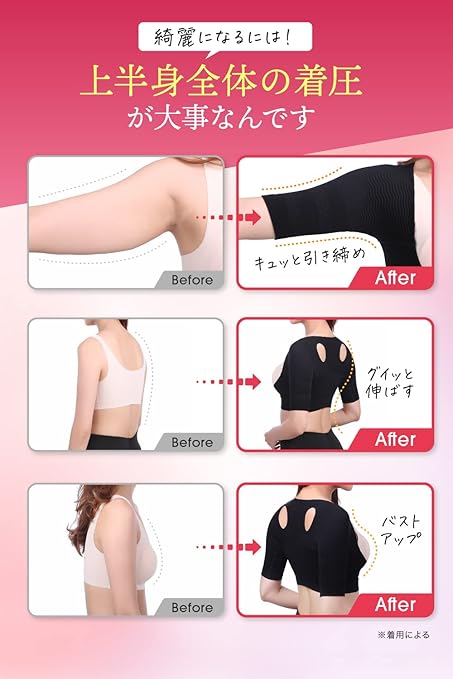 【着けた瞬間、姿勢美人】接骨院監修、バストを綺麗に寄せ、二の腕を引き締め、肩甲骨を整え美姿勢を保ち、美しくなれる二の腕シェイパー。肌にやさしい柔らか伸縮素材で、動きやすさと肌当たりに配慮しました。