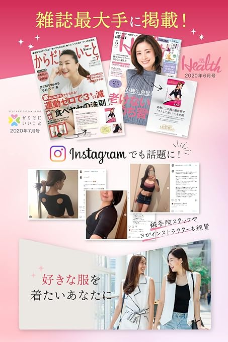 【長時間でも痛みを感じない】シンプルなデザインで響きにくい生地の薄さと、よく伸びる着圧素材を採用。外出中に無理なく着用できるので、普段の生活スタイルのまま「ラクして美しい」を実現。着ることで気になる二の腕、巻き肩、猫背、肩甲骨、脇肉、バストをこれ1枚でトータルケア。おかげ様で感謝の声を多く頂いております。