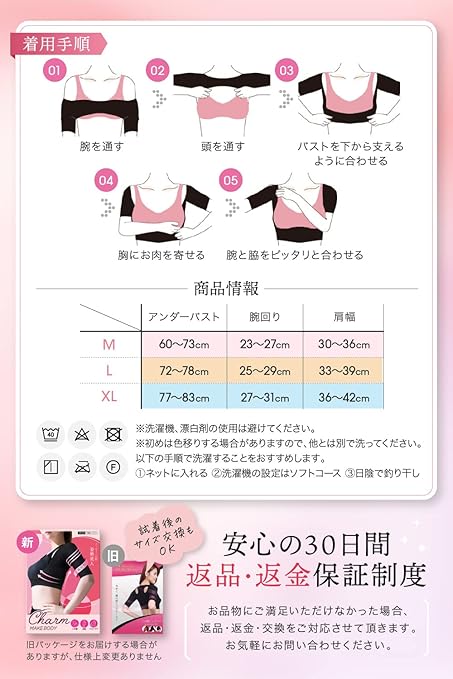 【サイズ】M, L, XL (Mサイズ:アンダーバスト60~73cm, 腕回り23~27cm, 肩幅30~36cm、Lサイズ:アンダーバスト72~78cm, 腕回り25~29cm, 肩幅33~39cm、 XLサイズ:アンダーバスト77~83cm, 腕回り27~31m, 肩幅36~42cm)※詳しくは商品画像をご覧ください。【タイプ】ホックなし(ブラック,ベージュ)、ホックあり(ブラック)の2タイプからお選びいただけます。商品選択時にお間違いのないようご注意ください。