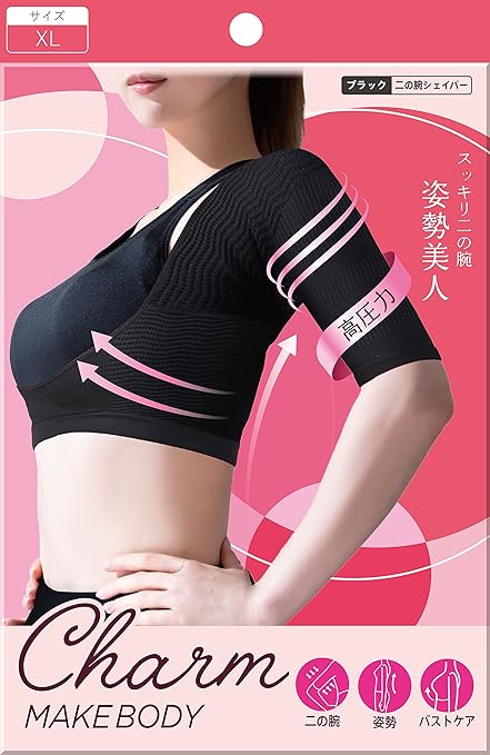 [チャーメイクボディ] 二の腕シェイパー 腕 サポーター 補正下着 引き締め 姿勢 巻き肩 猫背ベルト 着圧インナー 加圧ベルト 肩甲骨はがし 接骨院監修 (XL, ブラック, ホックなし)