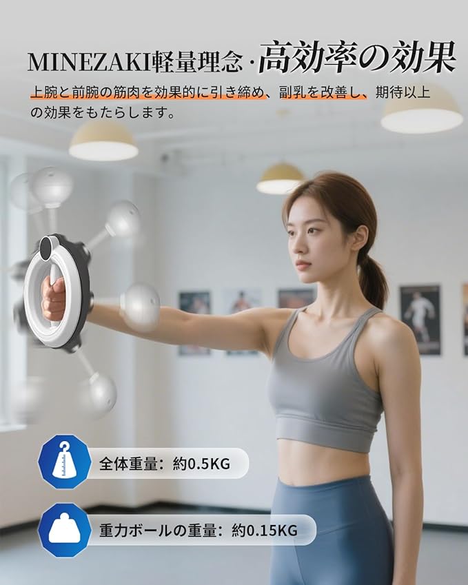 【軽量設計 により高い効果を発揮】二の腕ダイエット器具の全体重量は約0.45kgの軽量設計で、持ち運びが便利です。回転運動を通じて、吊るされた重力ボールが絶えず回転し、腕や副乳を刺激し続けることで、上腕や前腕などの腕の筋肉を効果的に引き締め、副乳を改善します。期待以上の運動効果を実感できます。