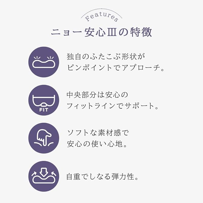 ✅【ニョー安心3の特徴】1. 独自のふたこぶ形状がピンポイントでアプローチ。 2. 中央部分は安心のフィットラインでサポート。 3. ソフトな素材感で安心の使い心地。 4. 自重でしなる弾力性。 小さくてコンパクト。電池や電源は不要で、いつでもどこでも使えます。隙間時間をみつけてまずは数分からスタート。10分間連続で使えるようになるまで、徐々に慣らしてご使用ください。※製造都合・生産ロットにより、商品の色味に多少の色差が発生する場合がございます。