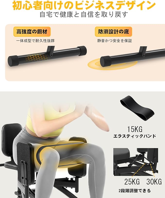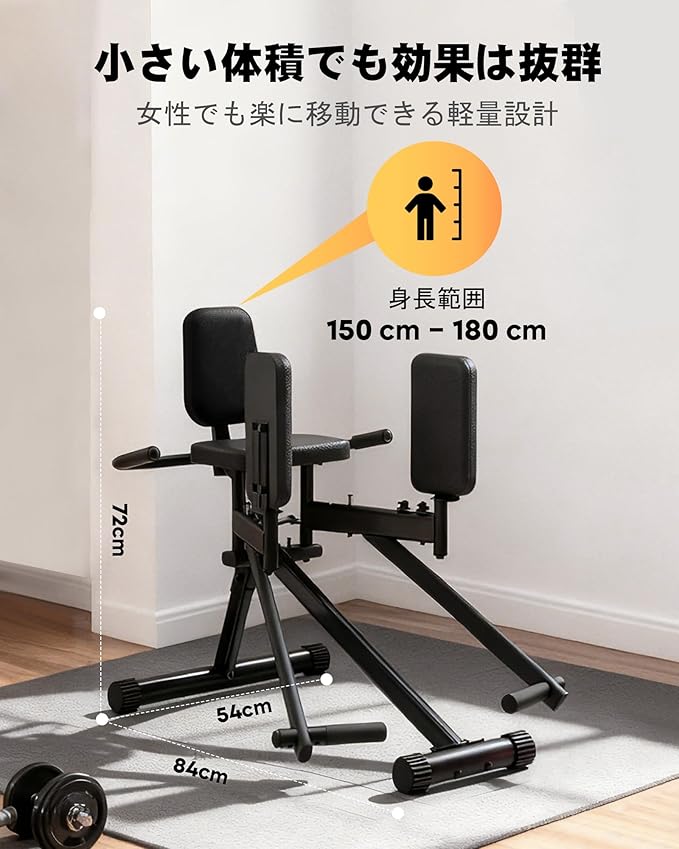【コンパクト設計でどこでもホームジム】サイズ(84 54 72cm)のコンパクト設計で、ごく狭いスペースにも設置可能。通勤なしで自宅で効率的に臀形とラインを塑造。滑りにくいベースと静音設計により、産後トレーニングや日常的なフィットネスにも対応。夜間や寝室でも音を気にせず使用でき、テレビを見ながら、または休憩中にサクッと運動できます。