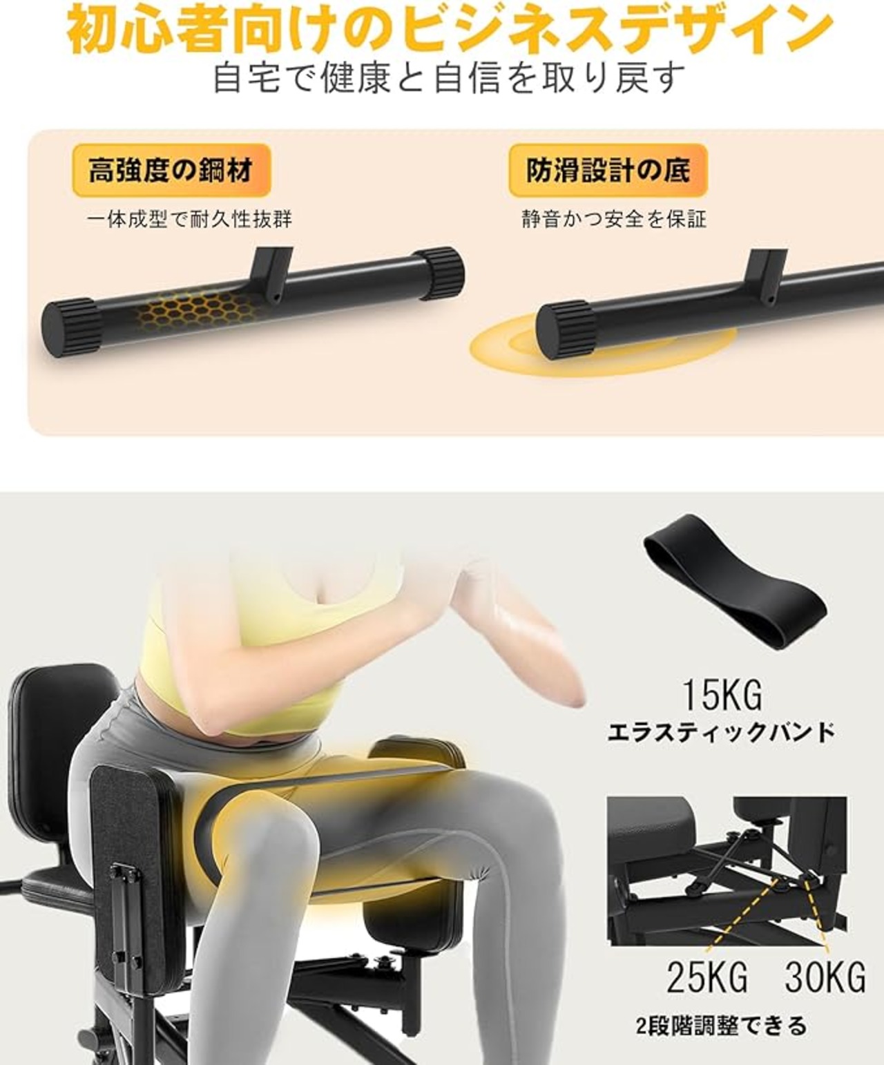 【2段階の負荷調節で多様なトレーニングに対応】 2種類の負荷レベルを搭載し、個々の筋力に応じたターゲットトレーニングが可能。付属のエクササイズバンドを使用すると、最大で45kgの負荷まで調節できます。男性・女性問わず、初心者でも自宅でジムレベルの高強度トレーニングができ、理想的なヒップアップとボディシェイプを最大限に引き出します。