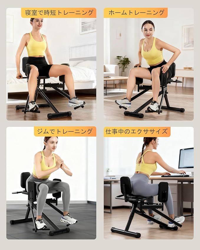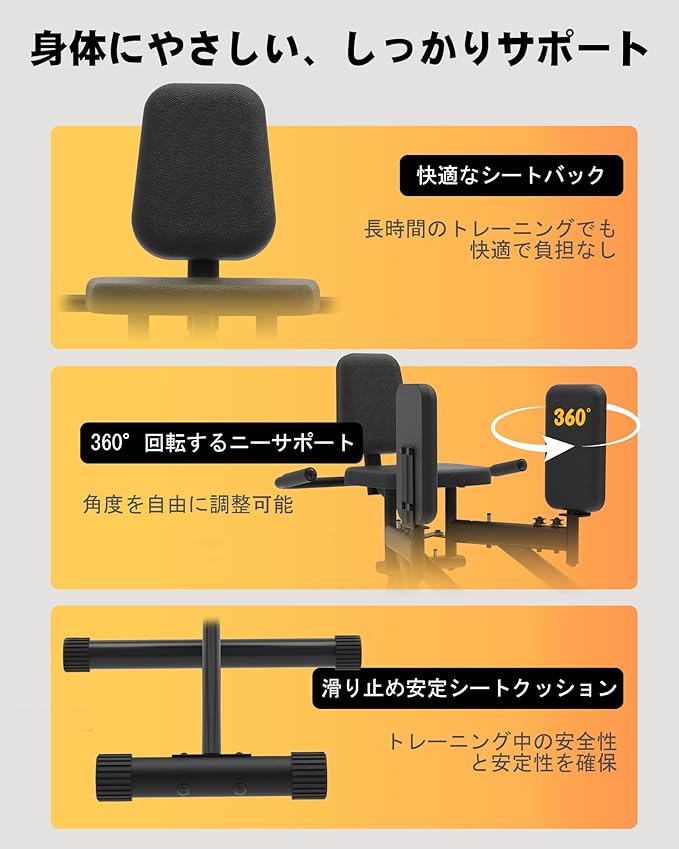 【安定したデザイン&快適な使用感】360 可動の足パッドと快適なシートクッションが脚部を優しくサポート。頑丈な三角鋼フレームで、安全かつ快適なトレーニング体験を提供。防滑設計の底面で安定性を確保し、静音性も兼ね備え、整機耐荷重150KGまで対応。