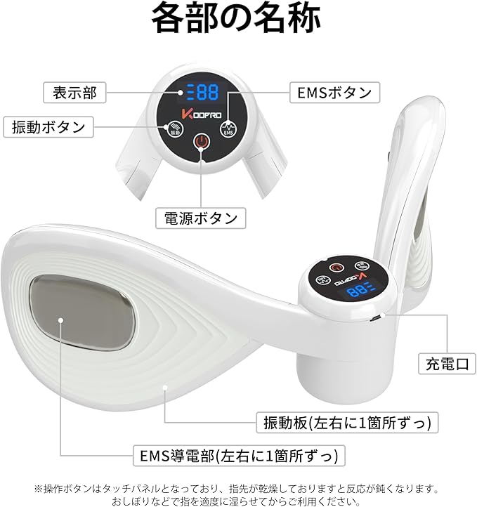 【操作簡単&男女兼用】「電源ボタン」を約3秒長押しするとピッと鳴り、「表示部」にバッテリ-残量が表示されます。「振動ボタン」を押すとピッと鳴り、「表示部」に振動レベル「1」が表示され振動動作を開始します。「1」~「5」までの5段階選べることができます。「EMSボタン」を押すとピッと鳴り、「表示部」にEMSレベル「1」が表示され電気刺激動作を開始します。「1」~「10」までの10段階選べることができます。充電式なので、どこでもお使いいただけます。
