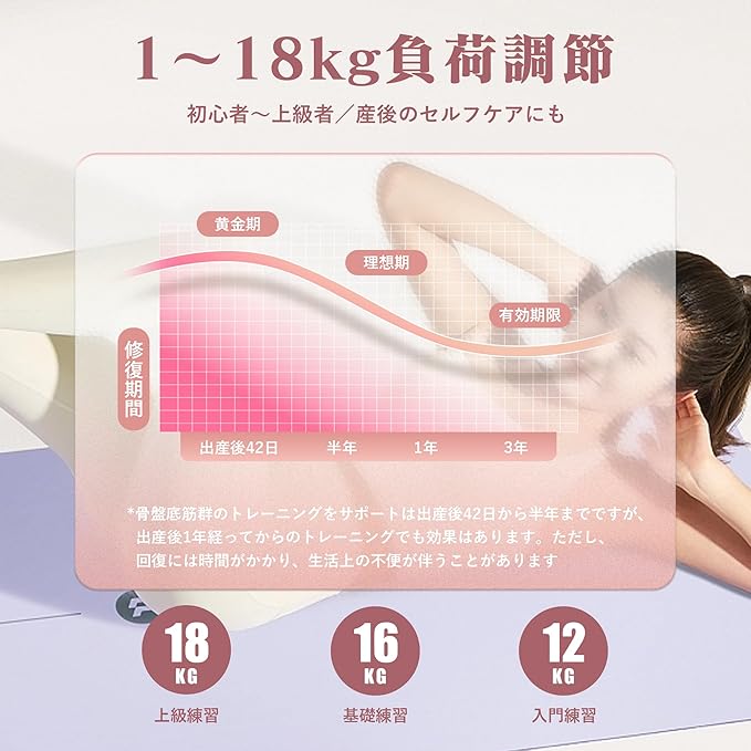 【1〜18kg負荷調節|女性に特化した設計】 バックルを調整するだけで、負荷を1kg〜18kgまで細かく変更可能。初心者のシェイプアップから、本格的な内転筋・体幹トレーニングまで幅広く対応。「きつすぎて続かない…」という悩みを解消し、無理なく美脚・美尻へ