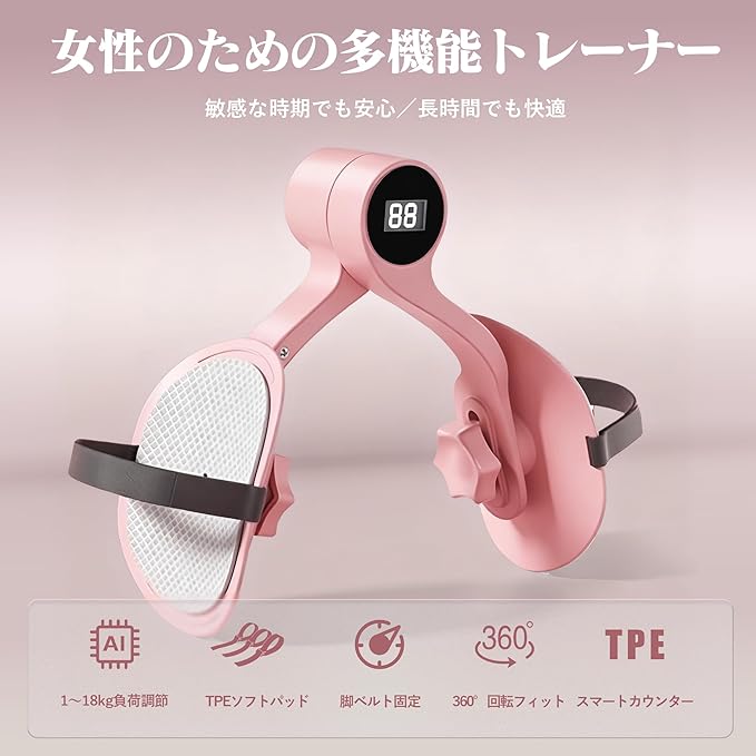 骨盤底筋 トレーニング器具【回数が見えるスマートカウンター】 内転筋 筋トレ ヒップアップ 太もも引き締め 1~18kg負荷調節 360 回転パッド 滑り止めバンド付き 産後ケア 美尻 フィットネス