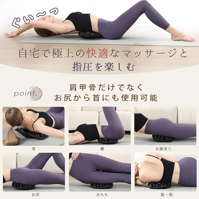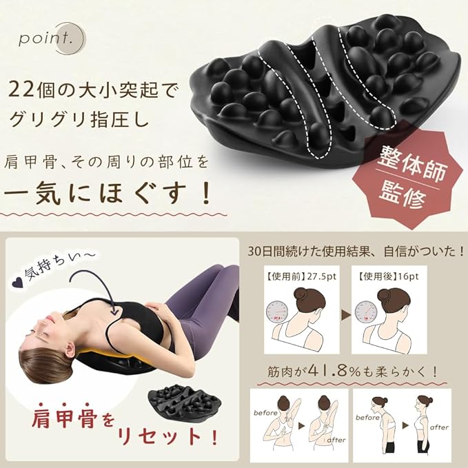 【独自の立体形状設計技術・22個の突起が ツボを指圧】計22個の大小形状の異なるグイ押し突起が優しくほぐす!独自の立体形状が、どんより肩甲骨をクイッと持ち上げ程よくストレッチ。さらに大小形状の異なる計22個グイ押し突起が、肩甲骨を中心に広い範囲をググッと!寝ながらでも座りながらでも使えるから、どんな状況でも肩甲骨のケアがOK。硬度 形状 突起配列のすべてにこだわった「グイ押し」が貴方の身体を癒してくれます。