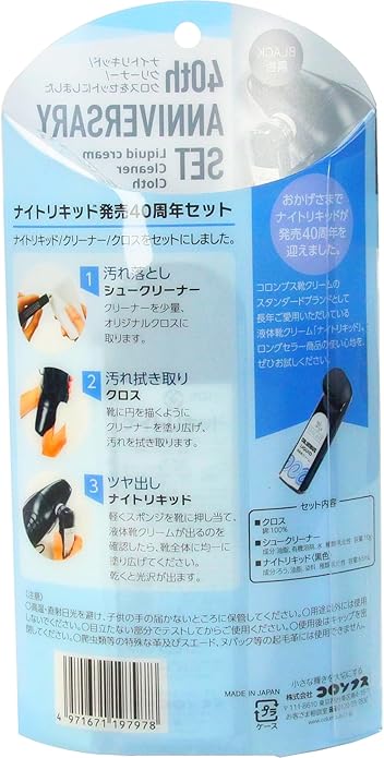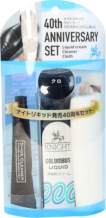 おかげさまでナイトリキッドが発売40周年を迎えました。 コロンブス靴クリームのスタンダード限定商品として長年ご愛用いただいている液体靴クリーム「ナイトリキッド」。 累計販売数7,000万本を超えるロングセラー商品の使い心地を、ぜひお試し下さい。 商品内容:ナイトリキッド【黒】・クリーナー・クロスの3点セット。
