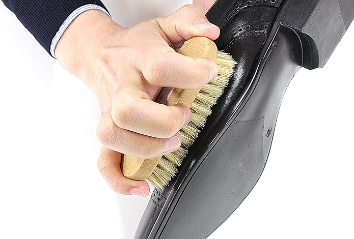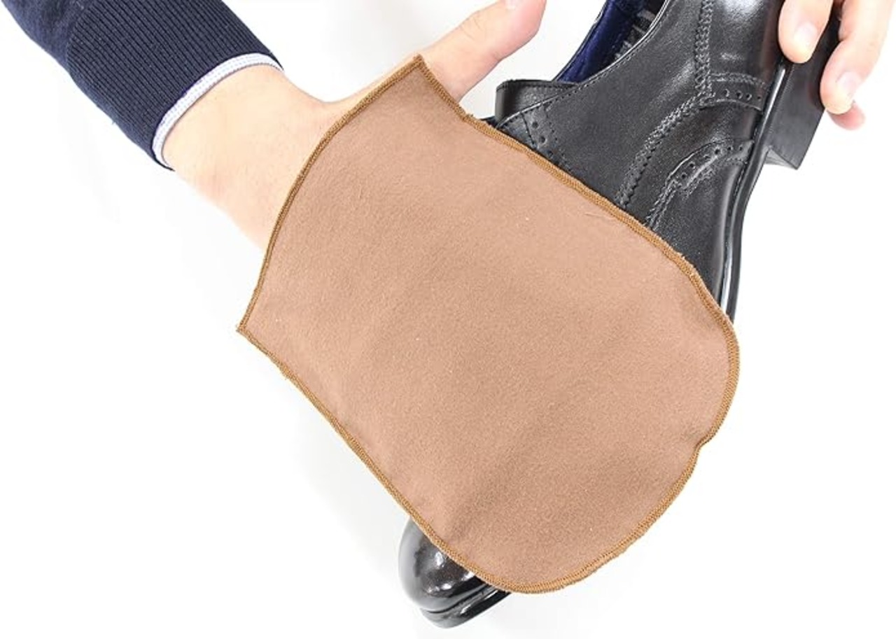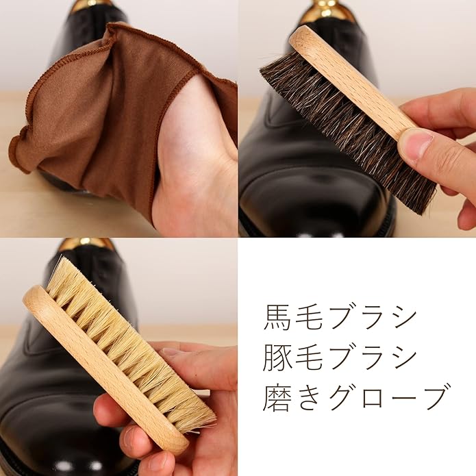 【お手入れの手順】1馬毛ブラシで靴全体のホコリを払います。 2ツーフェイスローションを柔らかいクロスに適量とり、靴全体をやさしく拭きます。 3シュークリームを塗布用ブラシに米粒3粒程度の量とり、全体に均一に塗り広げます。 4豚毛ブラシで靴全体をブラッシングして、クリームを靴に馴染ませます。 5仕上げ用クロスで乾拭きをして完成です。